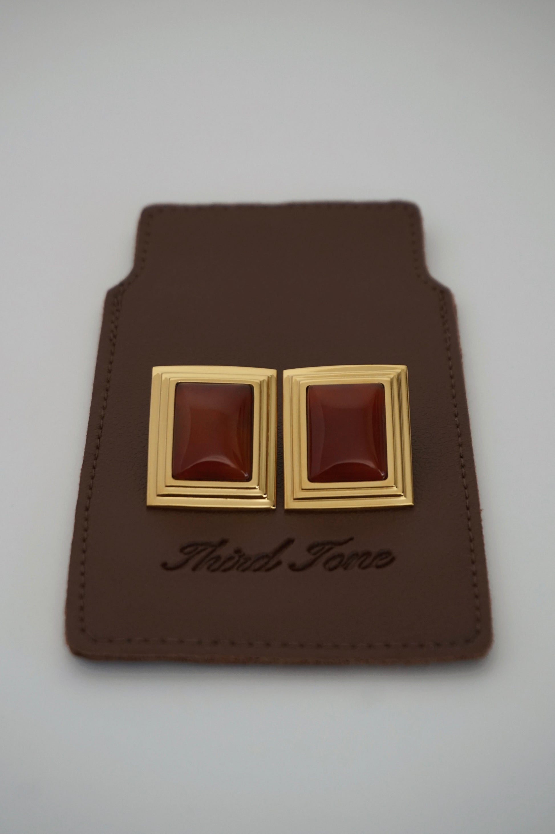 The Scarlett Earrings feature natural red agate gemstones, meticulously cut to fit perfectly within their layered frames. Each semi-precious stone is one of a kind, showcasing a spectrum of hues from deep crimson to burnt orange.